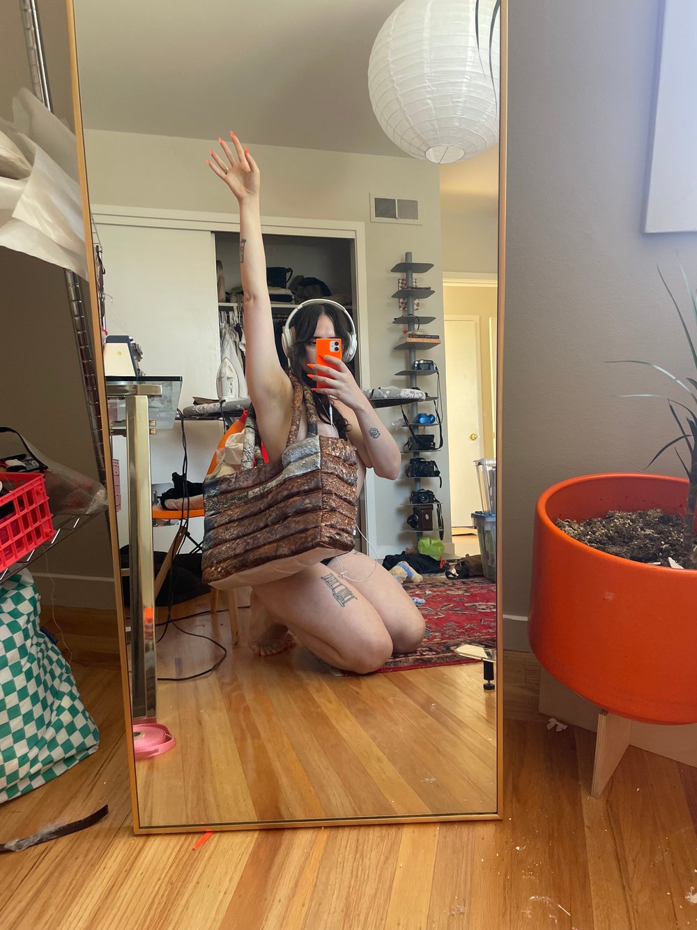 quilted tote bag made of satin fabric adorned with images of ~free dirt ~ listings from craigslist, polyester batting, and cotton blend lining. tote features sausage-like handles and exposed interior seams. designed, cut, and sewn by rel robinson in her san francisco studio.